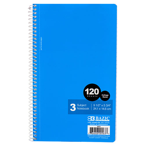 WHOLESALE BAZIC NOTEBOOK 9 X 6 120CT COLLEGE RULE 3-SUBJECT #563 SOLD BY CASE
