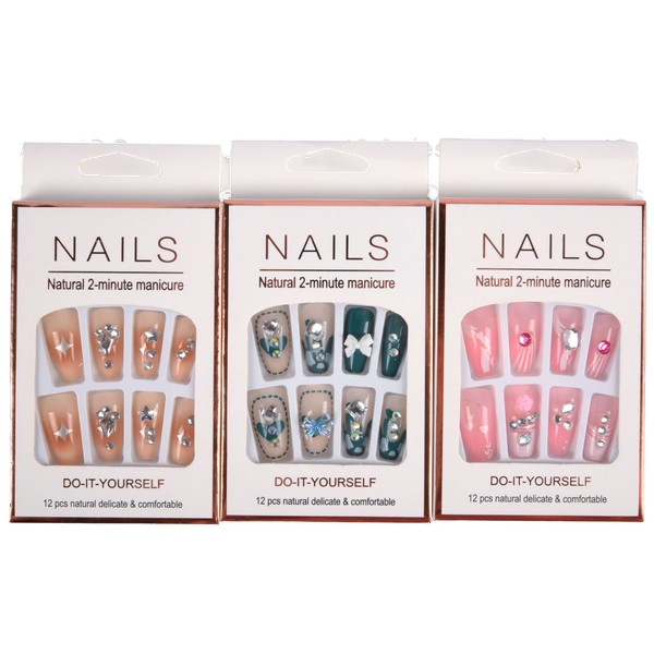 False Nail W/Stone Pre Glued Asst 12 Pc
